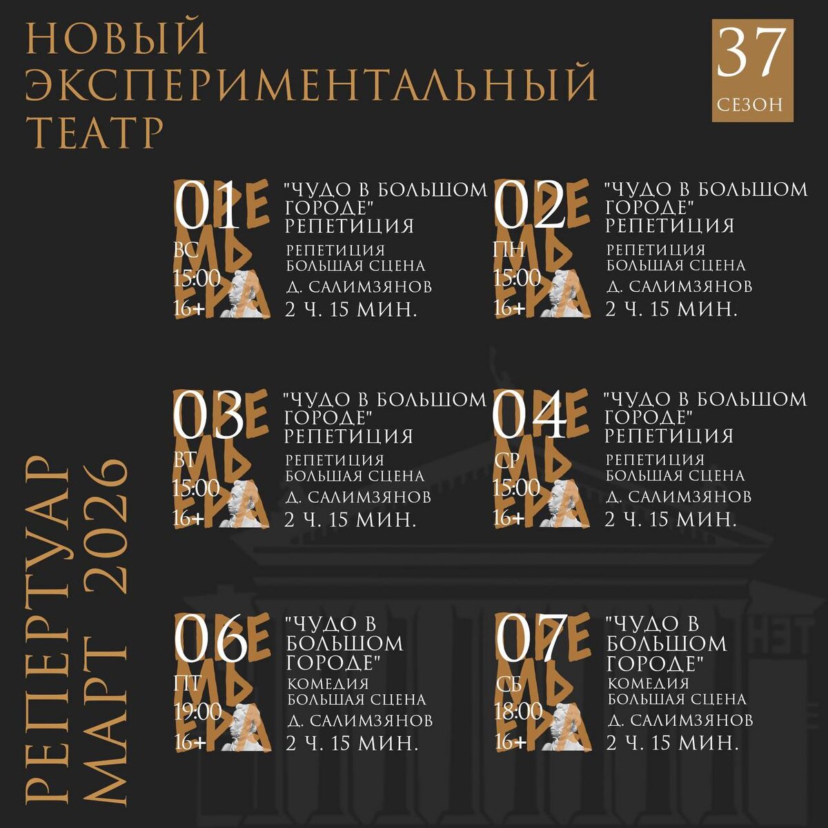 Запуск продаж объявляется ровно в 11.00. У вас есть совсем немного времени, чтобы успеть! Успеть купить билеты на любимые постановки или же на те спектакли, которые только мечтаете посмотреть! Предупреждаем сразу - НЭТ готовит в марте сразу несколько сюрпризов - один другого интересней! С 1 по 4 марта приглашаем зрителей на финальные репетиции спектакля “Чудо в большом городе”, а с 6 по 9 марта пройдут его премьерные показы - и это подарок НЭТа всем волгоградкам к Международному женскому дню. Сегодня в расписании - новогодние праздники, но мы уже думаем про весну - пору любви. В марте рекомендуем посмотреть спектакли “Миронов”, “Эдит”, “”Мама, это призрак и мы поженимся!”, “Дотянуться до мечты”, “Чайка. Мюзикл” и “Страсти по Тилю”. А еще не забудьте про “Мир Андерсена”, “Бунгало 21”, “Портрет Дориана Грея”, “Нотр-Дам” и другие. Наш вам совет: покупайте билеты сразу - завтра их может не быть! И не говорите, что мы вас не предупреждали. #нэт ул.Мира, 5