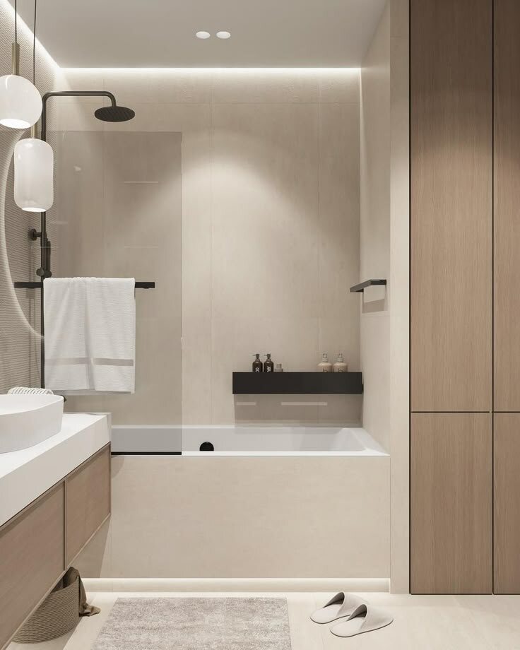 Светлая гамма традиционно считается универсальной, но её сила - не в привычности, а в способности управлять восприятием пространства. Когда светлая ванная - лучший выбор: Светлые оттенки отражают свет, визуально раздвигают стены и делают пространство более «дышащим». Даже компактная ванная в такой палитре выглядит аккуратно и собранно. Однако важно понимать: светлая ванная - это не обязательно белая. Работают и другие варианты: Такая палитра выглядит мягче и не создаёт ощущения стерильности. При неправильном подходе светлая ванная может выглядеть плоской и безликой. Минусы: Чтобы интерьер не выглядел скучным, важно добавлять: Что улучшает результат: Темная палитра работает иначе. Она не расширяет пространство, а создаёт ощущение глубины и камерности. Такой интерьер воспринимается более «архитектурным» и статусным. Темная ванная оправдана, если: Глубокие оттенки графит, антрацит, тёмно-коричневый, насыщенный синий - создают эффект уюта и приватности, особенно в сочетании с тёплым свето