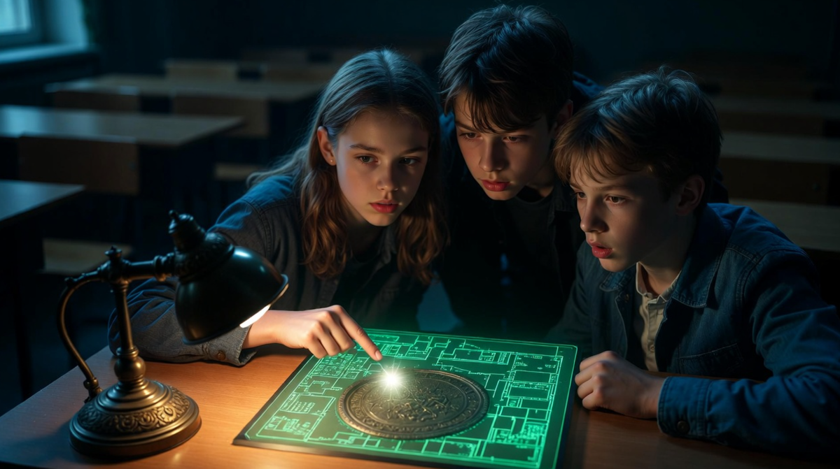 Возвращаясь из дворика Геометров, трое друзей шли не шагом, а почти бегом, сжимая в кулаках драгоценную находку. Воздух казался гуще, каждый шорох за спиной заставлял оборачиваться. У них в руках был не просто ключ — это был ключ от самой большой тайны Академии. Войдя в пустую, полутемную классную комнату недалеко от их общежитий, они наконец смогли рассмотреть медальон при свете обычной магической лампы.