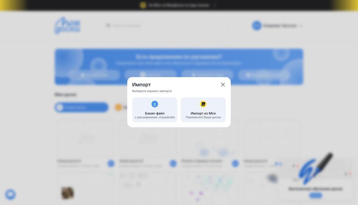 🚀Обновление - Импорт из Miro, запись видеоконференций и другое! С наступающим Новым Годом, Вас, дорогие пользователи! Лучшее поздравление от сервиса на мой взгляд - это обновление, итак... Теперь Вы можете перенести Ваши доски из Miro на МояДоска. Для этого достаточно установить расширение переноса и, используя его, скачать резервные копии Ваших досок! Подробная инструкция здесь (нажмите) сейчас успешно переносятся тексты, рисунки, стикеры, фигуры, фото, фреймы, embed-элементы, ссылки и PDF-файлы. Это была достаточно большая работа. Сейчас перенос и расширение работают в режиме бета-версии. Но постепенно будет расширяться набор переносимых инструментов и параллельно ведутся работы по оптимизации самой МояДоска плюс добавлению поворотов элементов, чтобы большие доски при переносе работали не менее эффективно. Кроме этого: ➖ Запись доски и видеоконференций - теперь можно записывать Ваши видеоконференции или просто работу на доске. Откройте окно конференции и нажмите кнопку записи,