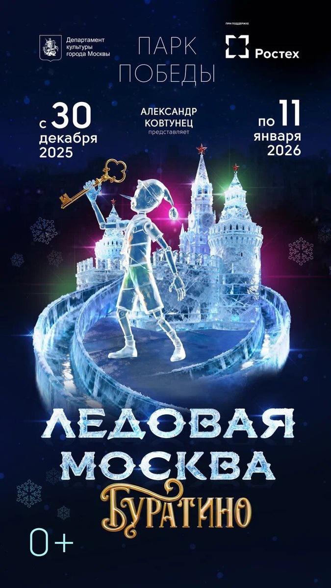 В кругу семьи" 30 декабря 2025 – 11 января 2026 12:00–22:00 В этом году главной темой фестиваля станет легендарная сказка «Буратино». Вас ждут: 🔵 Ледяной Кремль с каскадом ледяных горок 🔵 Ледовые скульптуры героев сказки 🔵 Закрытый ледовый и песочный павильоны 🔵 Фотозоны 🔵 Интерактивные площадки для детей 🔵 Анимационная программа 🔵 Карнавальные шествия 🔵 Шоу на большой сцене 🔵 Праздничная музыка 🎙30 декабря в 20.00 выступит Авраам Руссо. 1 января в 20:00 - Гоша Куценко 🪙Билеты можно приобрести здесь взрослый — 1000 руб., детский — 700 руб. Подробнее 📍 Парк Победы Ⓜ️ Парк Победы Фестивали в Москве 🔤🔤🔤🔤🔤🔤🔤