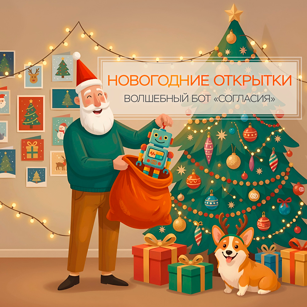 Только спокойствие! Покупать подарки всем вокруг необязательно! Главное в Новый год – это внимание и теплые слова. Новогодний бот «Согласия» поможет быстро создать именные открытки, чтобы ваши поздравления получили все родные, друзья и знакомые!