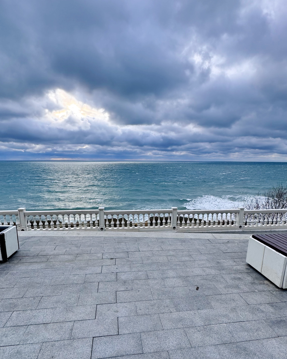 Зимнее море не имеет ничего общего с ласковым летним курортом. Это чистая, дикая мощь. Огромные свинцовые волны с грохотом разбиваются о бетон, взлетая белыми фонтанами брызг. Стихия ревёт. Ветер воет в ушах, заглушая все мысли о салатах, уборке и Деде Морозе.