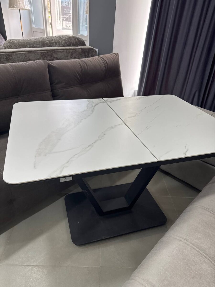 На фото представлен современный стол, который имеет прямоугольную форму и выполнен из двух основных материалов: столешница из керамогранита