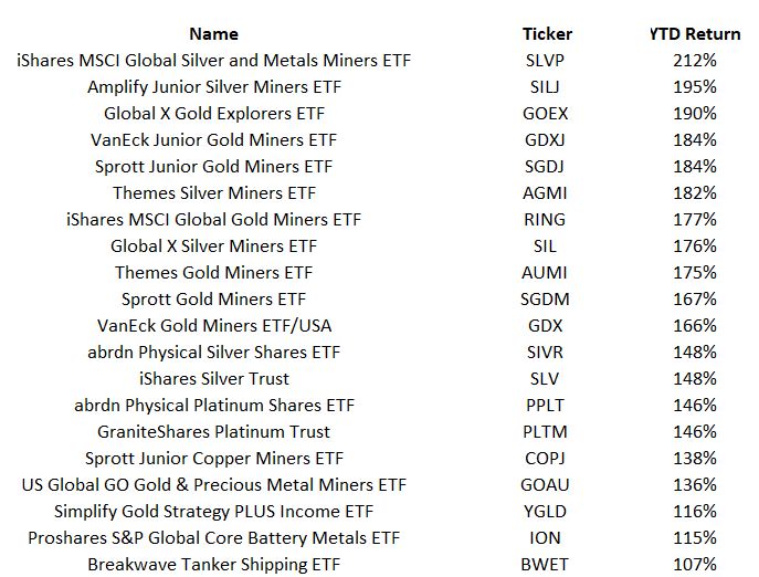 2025 стал годом доминирования драгоценных металлов в ETF-пространстве. Первые 15 мест в рейтинге доходности заняли фонды, связанные с золотом, серебром, платиной и палладием напрямую или через акции добывающих компаний. Это движение носило исторический характер. К 24.12 золото выросло на 71% с начала года, серебро и платина - на 149%, палладий - на 89%. За исключением палладия, все металлы обновили исторические максимумы. Базовым драйвером выступило золото: военные конфликты, торговые войны, рост госдолга, инфляционные риски, вопросы независимости ФРС и устойчивый спекулятивный спрос. После золота инвесторы начали искать более дешёвые и более волатильные способы отыграть ту же тему, получилось через серебро и платиновые металлы. Однако максимальную доходность дали не сами металлы, а майнинговые ETF. VanEck Gold Miners ETF ($GDX) вырос на 166% и впервые с 2019 г. обогнал золото, но при этом оказался лишь на 11-м месте рейтинга. Лидером года стал iShares MSCI Global Silver and Metals Min