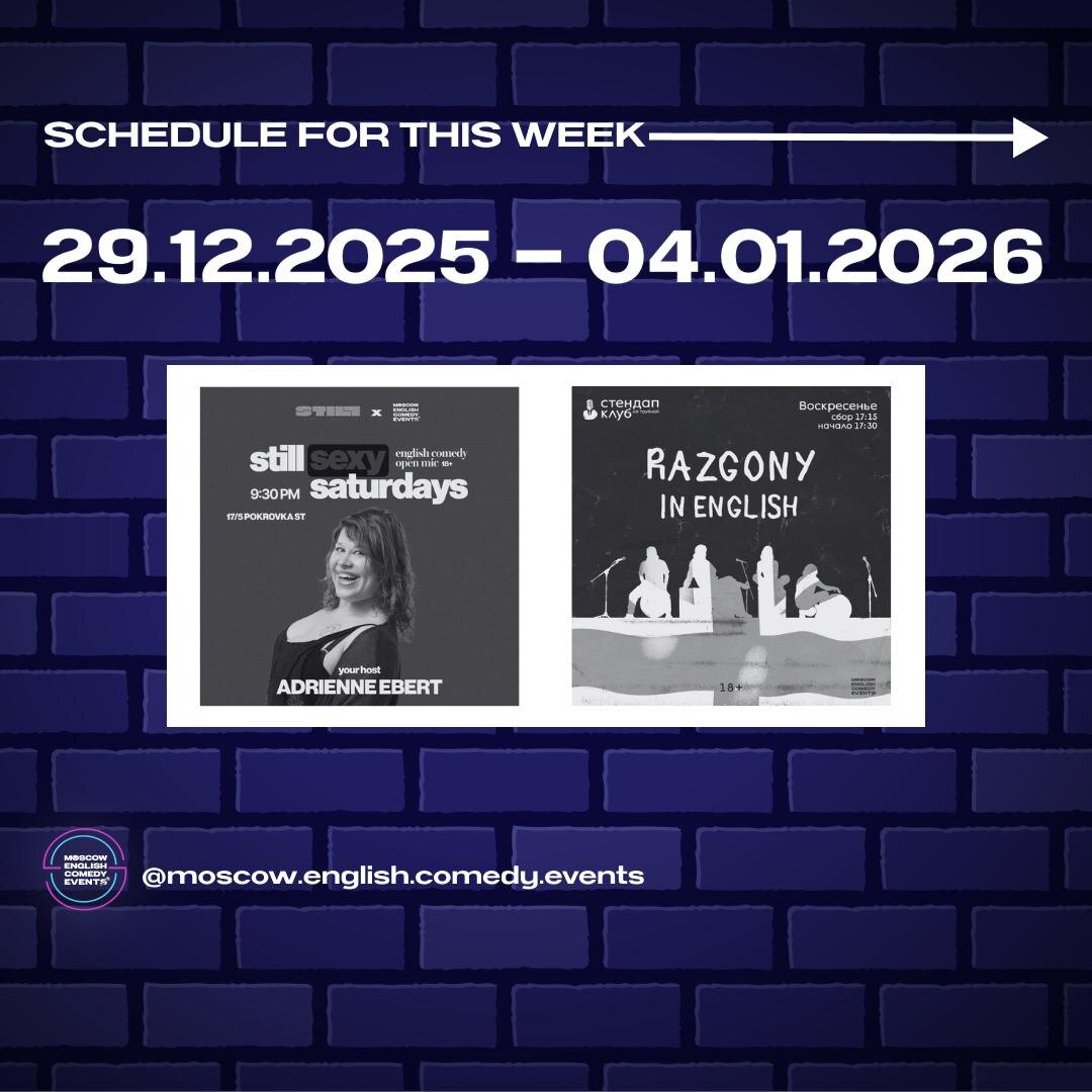)❗️ -----‐----------------------- 🕤Saturday, January 3rd, 9:30 PM – Still Sexy Saturdays 🎤Open Mic 🎟Entrance: Pay what you want (any paper note or transfer) 💵 🔗 Register for free 🫰 pay upon arrival 📍Still StandUp Moscow 🗺 Pokrovka 17c5, through the arch with the pink lights 🏙 Blue building directly inside the courtyard -----‐----------------------- 🕠Sunday January 4th, 5:30 PM - Razgony in English 🍿Panel of comics riffs off each other's jokes and ideas 🎟️Entrance: FREE 💸 Food/drink purchase required 🥗 donations welcome 🔗Reserve for free 📍Stand Up Club на Трубной 🗺 Map: Rozhdestvensky Blvd, 10/7 С1
