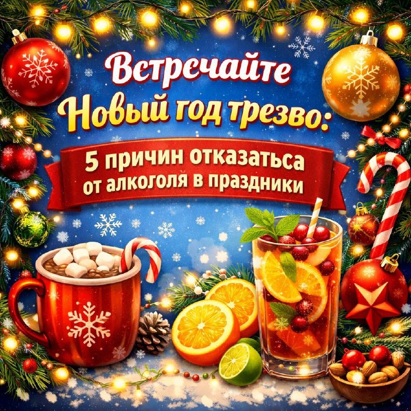 : ✅ Энергия с утра — встретите рассвет без головной боли. ✅ Яркие воспоминания — запомните каждый момент. ✅ Настоящее общение — услышите друзей без «шума». ✅ Сохранённый бюджет — сэкономленные деньги на подарки или хобби. ✅ Иммунитет без удара — особенно важно в сезон гриппа. Чем заменить традиционный алкоголь: ✨ Безалкогольный глинтвейн — с пряностями, яблоками и апельсинами ✨ Игристые морсы — из клюквы, облепихи или граната ✨ Ароматные чаи — с имбирём, мёдом и специями в красивых чашках ✨ Фруктово-ягодные лимонады — украсьте мятой и ягодами Идеи для трезвого праздника: — Караоке-марафон с горячим какао — Настольные игры с безалкогольными коктейлями — Создание семейной капсулы времени с пожеланиями на будущий год Новый год — это магия, а не алкогольное опьянение. Подарите себе праздник, который запомнится!