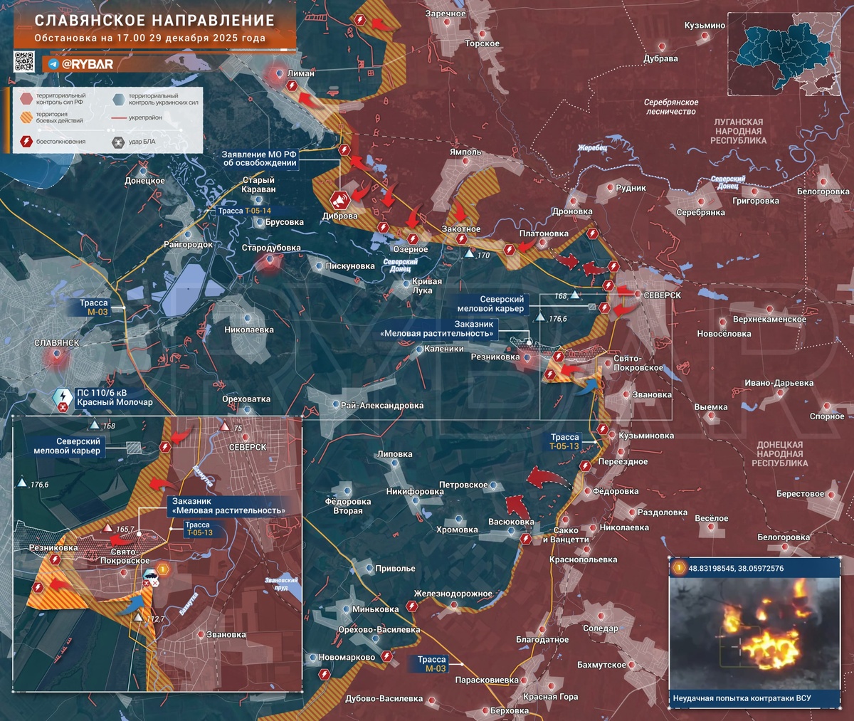 Бои на высотах западнее Северска набирают обороты: противник, стремясь не допустить закрепления ВС РФ на достигнутых рубежах, предпринимает механизированные контратаки, в том числе в районе Свято-Покровского. 🔻Как складывается ситуация 🔸Есть сообщения о продвижении на рубеже Платоновка — Северск, хотя информация оттуда поступает противоречивая. 🔸В районе Свято-Покровского украинские формирования провели контратаку, пользуясь непогодой. БМП с десантом смогла проскочить на восточную окраину Свято-Покровского из полей к западу от Звановки, но была сожжена дронами. Десант успел рассеяться по прилежащим строениям, однако позднее был уничтожен. 🔸Продолжаются бои за Резниковку, куда российские подразделения уже зашли на восточные окраины населенного пункта. 🔸С фланга южнее поступают противоречивые сообщения. Хотя Петровское (Пазено) и Васюковка уже были объявлены освобожденными, оттуда так и не появилось кадров объективного контроля. 📌 Довольно любопытно, что ВСУ нарастили контратаки по