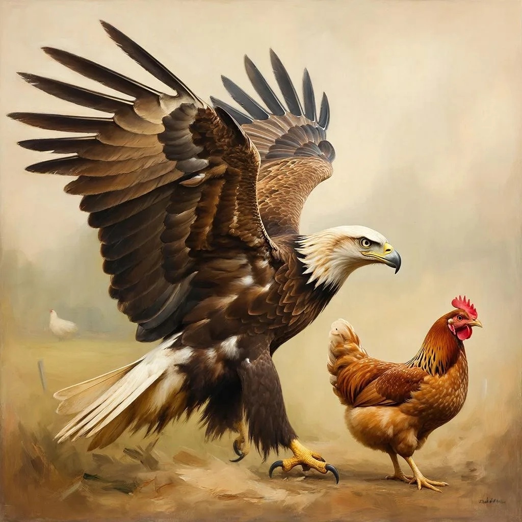 Двор с курятником. На фоне грязной земли — могучий орёл с подрезанными инстинктами, который робко клюёт зерно рядом с курами. А в небе, за пределами забора, летит его тень — вольная, царственная, уходящая в облака.