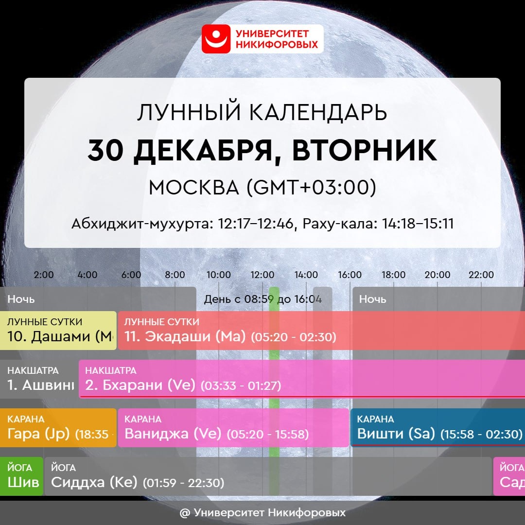 Энергетика дня не поддержит важное и новое, она в большей степени направлена на очищение и освобождение пространства, чтобы обеспечить место тому, что появится позже. Может ощущаться упадок сил, не стоит ожидать и требовать от себя и других, лучше максимально снизить нагрузку. После 15:59 в энергиях момента добавляется капля яда: постарайтесь избегать любых интоксикаций, лучше, чтобы ужин был более легким, чем обычно, особенно в преддверии завтрашнего застолья. День сам по себе располагает к аскезам и самоограничению. Сегодня Экадаши – день для поста в ведической традиции. Можно традиционно исключить зернобобовые и продукты животного происхождения кроме молочных или провести день на фруктах и овощах. Однако имейте в виду, что в холодное время года желательно отдавать предпочтение термически обработанной пище – увлекаться сыроедением не стоит.