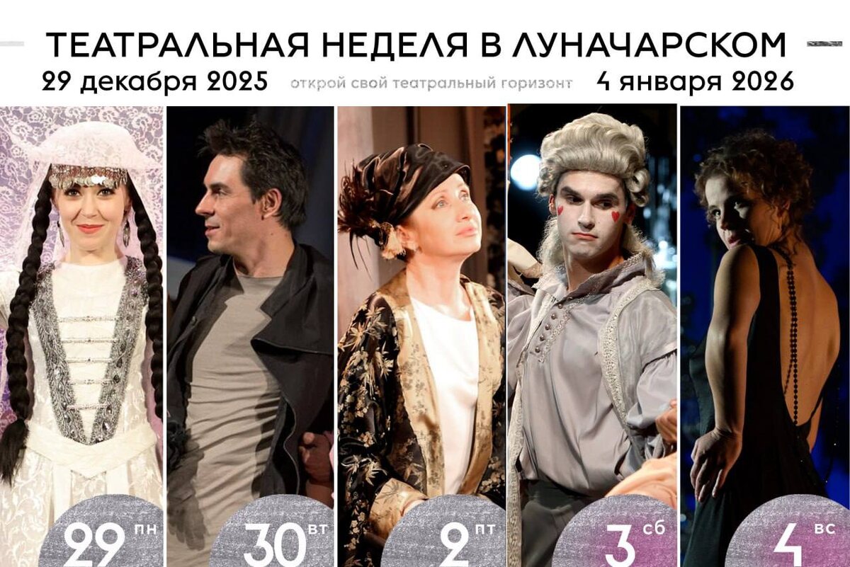 🎄29 декабря Понедельник ☃️18.30 Основная сцена В.Константинов, Б.Рацер «Ханума», свадебное приключение в грузинском стиле, 12+ (постановка – Г.Лифанов) СОСТАВ: Котэ – Роман Шукри, Текле – Алла Салиёва, Тимоте – Алексей Красноженюк, Сонэ – Александра Шабалина 💌Да будет каждый новогодний мандарин усилителем иммунитета, каждый хоровод -поводом для приятного знакомства, а в каждом елочном шарике отразится вся ваша душевная красота! 🎄30 декабря Вторник 10.00 и 12.30 Основная сцена Ш.Перро «Золушка», музыкальная сказка, 6+ (постановка Е.Журавкин) ☃️18.30 Основная сцена В.Денисов «Снегопад для Киры», комедия,16+ (постановка – Н.Слепченко) 💌Желаем, чтобы в наступающем году вы нашли того, кто будет вас ценить, любить, оберегать и дарить снегопады! 🎄31 декабря Среда 11.00 Основная сцена Ш.Перро «Золушка», музыкальная сказка, 6+ (постановка Е.Журавкин) ☃️17.00 Основная сцена В.Мухарьямов «Актриса», комедия,16+ (постановка – Н.Слепченко) СОСТАВ: Босякин - Андрей Бронников. 💌Пусть загадан