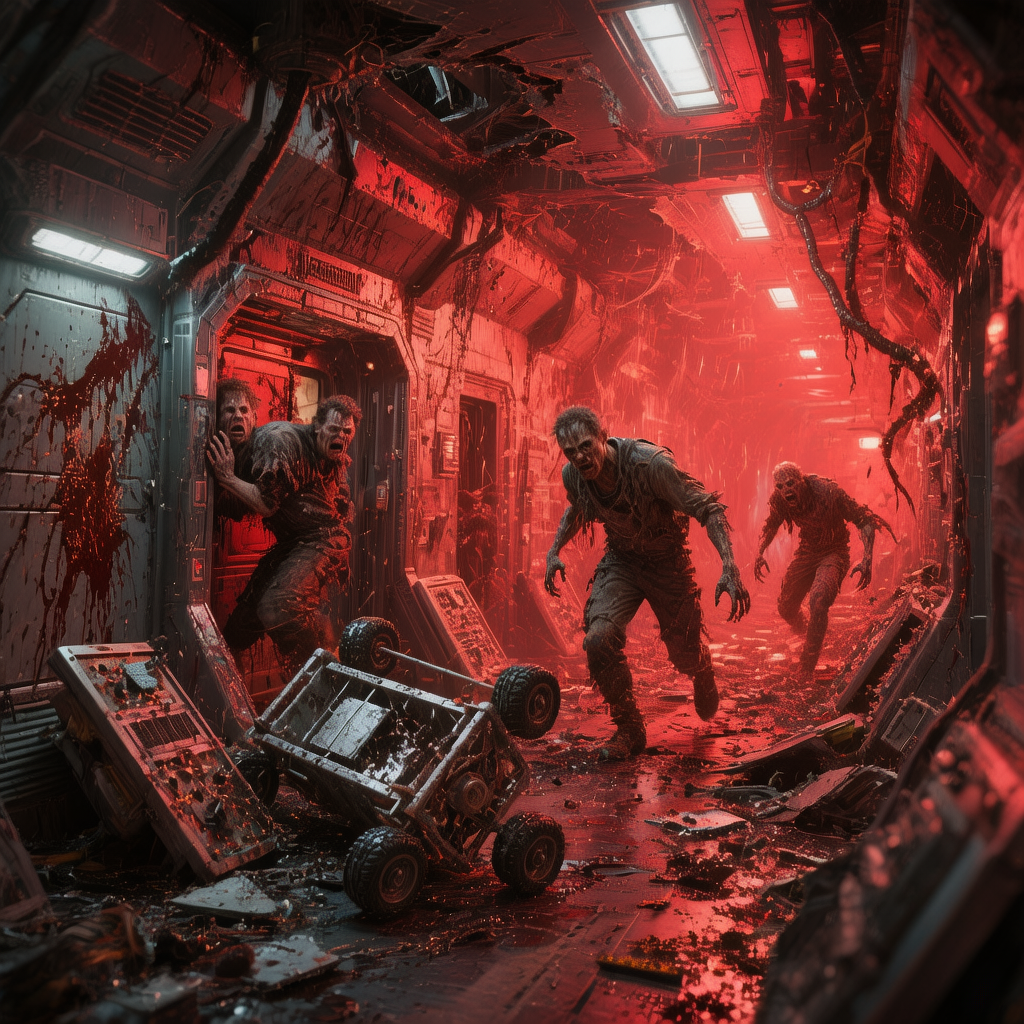 Картинка прыгала, залитая аварийным красным светом. Коридоры, заваленные обломками панелей управления и опрокинутыми грузовыми тележками. По стенам — брызги чего-то темного и вязкого. И люди. Нет, уже не совсем люди. Одни метались в панике, с дикими глазами, пытаясь забаррикадироваться в отсеках. Другие — их было меньше, но они были страшнее — двигались с неестественной, звериной целеустремленностью. Они не кричали. Они рычали. И бросались на всех подряд, не разбирая своих и чужих, сокрушая все на пути голыми руками, ломая пальцы о плексиглас забрал тех, кто пытался их удержать.