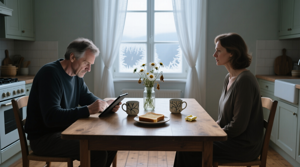 Я сидела, уставившись в окно на серое ноябрьское небо, Юрий — в экран планшета, листая новости. Между нами на столе лежала ваза с увядающими хризантемами, купленными на днях, и тост, который никто не торопился есть. Воздух был густым от всего несказанного.