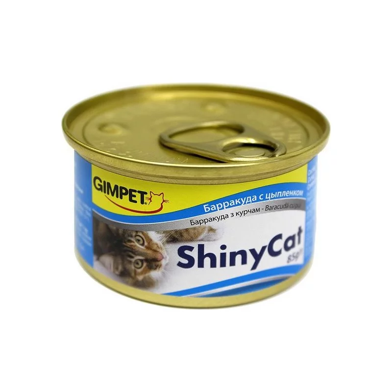 Чтобы оценить качество, берем конкретный продукт — популярный влажный корм Gimpet ShinyCat «Тунец с цыпленком». Заявлено: премиум-класс, без консервантов, для всех кошек.