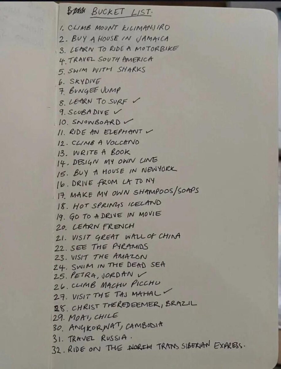 Инсайдерские аккаунты, давно следящие за артистом, выложили перечень из 36 пунктов, часть из которых уже отмечена как выполненная. В планах — прокатиться на Транссибирском экспрессе, поплавать с акулами, отправиться в путешествие по России. И маленькая, но эффектная деталь в конце — научиться танцевать на пилоне.
