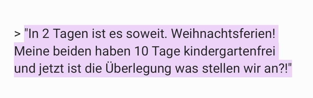 "Через 2 дня начнётся. Рождественские каникулы! Мои двое (детей) целых 10 дней не будут ходить в садик, и теперь мы думаем, чем бы заняться?!"