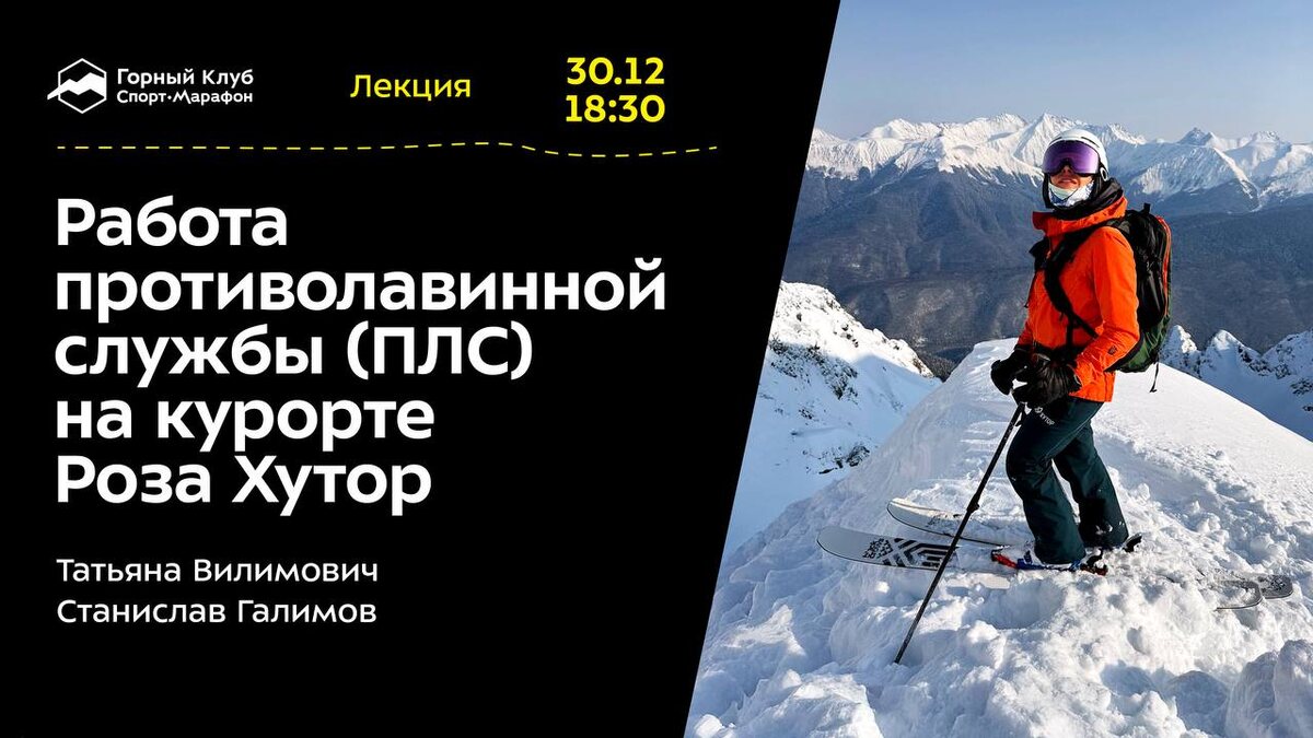 ⬇️ 📆 30 декабря 18:30 | среда Работа противолавинной службы (ПЛС) на курорте Роза Хутор Лекция от инженеров по проведению лавинных работ Роза Хутор, профессионалов с многолетним практическим опытом — Татьяны Вилимович и Станислава Галимова. На лекции вас ждет знакомство со службой, последовательный рассказ о подготовке Курорта к зимнему сезону, в том числе о том, как готовят систему Gazex, работа которой неизменно сопровождает отдых на горнолыжном курорте каждый зимний сезон. 📆 2 января 18:30 | пятница PUMA TRAINING: Комплексная тренировка. Горнолыжный сезон 2025/26, приходите тренироваться вместе с PUMA TRAINING и Горным Клубом Спорт-Марафон! 1,5 часа. Только практика. Надежда Шамбер — тренер, тренер-реабилитолог в команде Rehab Russia, массажист, действующая спортсменка FWTQ, чемпионка России по фрирайду. 📆 3 января 18:00 | суббота Квиз, плиз! [КАРАОКЕ] ПОД ЁЛКОЙ Let it snow! Чтобы Новый год был снежным, нужно громко петь любимые песни. Даже если вам кажется, что вы знаете м
