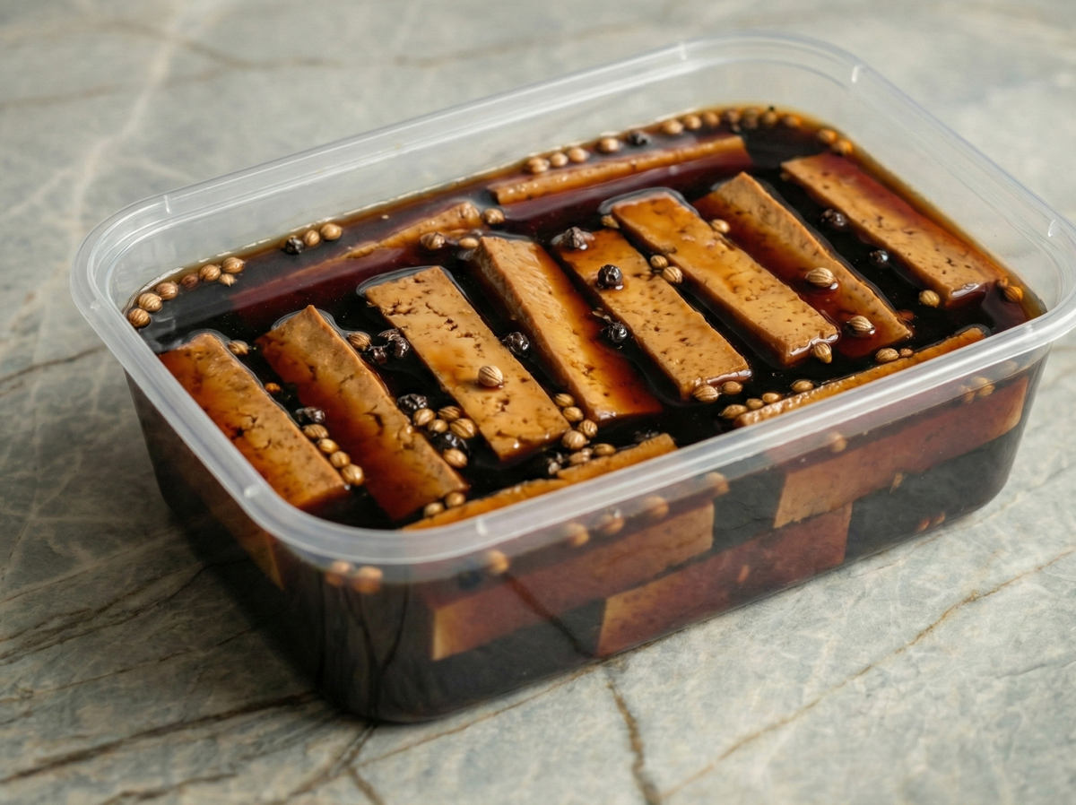 До Нового года 2 дня. Салат "Сельдь под шубой" в вегетарианском исполнении мы разобрали, переходим к тяжелой артиллерии. Шпроты – это вкус копчения и нежнейшая текстура. Обычно веганам предлагают взять «дубовый» тофу и залить его «жидким дымом». Получается резиновая губка с химическим привкусом. Мы пойдём путем гастро-инженера: Почему средняя мягкость? Я перепробовал все виды тофу. За 20 минут до старта залейте горсть щепы водой. Режем тофу на брусочки (~1 см). Заливаем маринадом. Не трясите контейнер, чтобы не поломать! В холодильник на ночь. Шаг 2. Бандаж из нори Достаём тофу. Режем нори на полоски. Оборачиваем каждый кусочек. Физика: Влажный тофу приклеивает нори намертво. Теперь водоросль работает как экзоскелет — она не даст нежному тофу развалиться. Ждём 5-7 минут. Можно повторить процедуру 1-2 раза для цвета. Но не рекомендую, иначе будет сильно горчить. Аккуратно перекладываем копчёные тофу-шпроты (шпротинка к шпротинке) в банку. Заливаем рафинированным маслом. Масло «запрёт» д