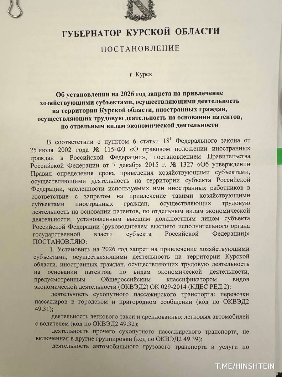 С 2026 года в Курской области мигрантам запретят работать в нескольких ключевых сферах. Под запрет попадают грузовые и пассажирские перевозки, включая такси, курьерская доставка, общественное питание и подбор персонала. Работодателям дадут три месяца, чтобы расторгнуть трудовые договоры с иностранными сотрудниками. Губернатор Александр Хинштейн уверен, что эта мера поможет улучшить качество услуг и жизнь курян. Ранее похожие ограничения уже ввели в Крыму и Петербурге. #КурскаяОбласть #мигранты #трудоустройство Коллектор событий нашёл эту новость в каналах: RT на русском • ВЕСТИ • Verum Regnum|Наш Regnum • ЕЖ • ТАСС ℹ️ Информация собрана нейросетью из публичных источников и не является официальной. 📰 Читайте Коллектор Событий: В Телеграм: https://dzen.ru/id/69282fd0368998038a2b989d В Дзен: https://dzen.ru/event_collector В ВКонтакте: https://vk.com/collector_event