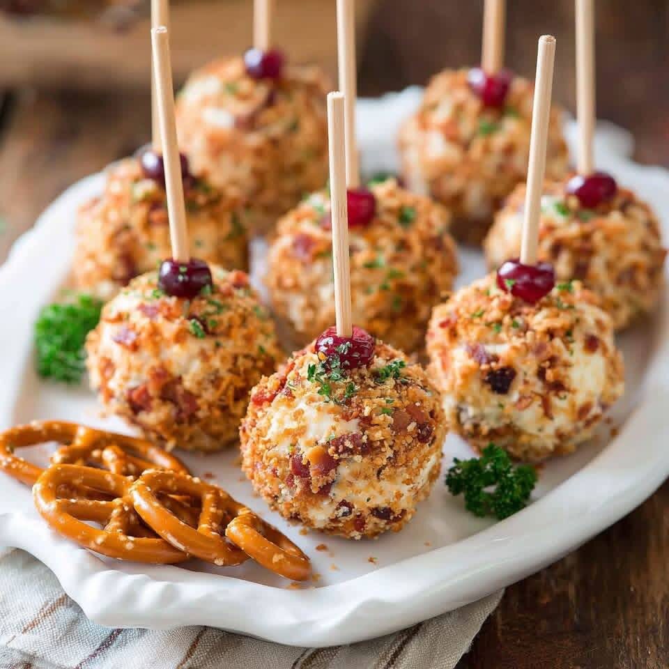 👥 Для : 8 человек (около 12 сырных шариков) ⏱️ Приготовление : 20 минут 🛒 Ингредиенты Сырная основа 🧀 300 г свежего сыра (Сен-Мор, Филадельфия...) 🧀 80 г тертого сыра чеддер или Эмменталь 🌿 1 столовой ложки измельченной зелени петрушки 🧂 1 щепотка соли ⚪ 1 щепотка перца Хрустящее покрытие 🥓 80 г бекона, обжаренного на гриле, затем мелко нарезанного 🍒 50 г сушеной клюквы, нарезанной небольшими кусочками 🍞 3 столовые ложки хрустящих панировочных сухарей Украшение 🍒 12 маленьких целых ягод клюквы для начинки 🍢 12 деревянных шпажек 👩 🍳 Этапы приготовления 1.🧀 Приготовьте сырную основу В салатнице смешайте свежий сыр с тертым сыром чеддер, петрушкой, солью и перцем. Замешивайте, пока не получите однородное, слегка твердая масса. 2. Сформируйте Сформируйте из получившейся массы сырный шарик. Проделайте это так, чтобы получилось примерно 12 одинаковых шариков. 3.🔪 Приготовьте хрустящее покрытие Смешайте на тарелке раскрошенный поджаренный бекон, кусочки клюквы и панировочные с