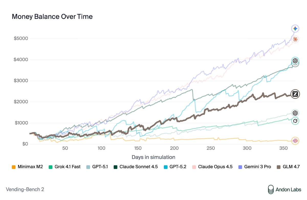 📝 Кратко: Китайская открытая модель GLM 4.7 от Zhipu AI заняла шестое место на Vending-Bench 2 — бенчмарке, где ИИ управляют виртуальным вендинговым автоматом в течение условного года. С результатом $2376 она обошла GPT-5.1 ($1473) и стала первой прибыльной открытой моделью в официальном лидерборде. Все модели стартуют с $500 и платят $2 в день за аренду автомата — если баланс уходит в минус на 10 дней п... 🔗 Читать оригинальную статью (ссылка) 📊 Источник: Habr ⏰ Время: 29.12.2025 14:24 📱 Другие каналы: 🪙 ВКрипту | 🎮 ВИгрухи | 🏎️ ВТачки | ✈️ ВТравелу #gadgets #гаджеты #технологии