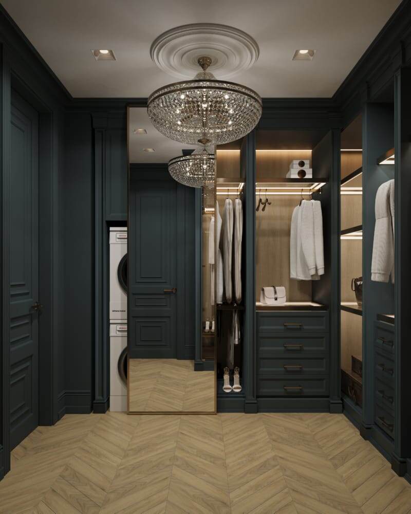 В компактной спальне или узкой прихожей часто не хватает места для вместительного шкафа, поэтому систему хранения размещают в гостиной.