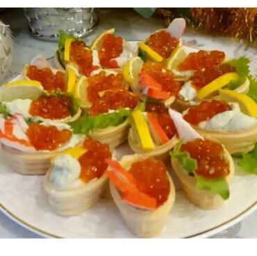 · Подача: Выложите тарталетки на большое блюдо, украшенное листьями салата и дольками лимона.