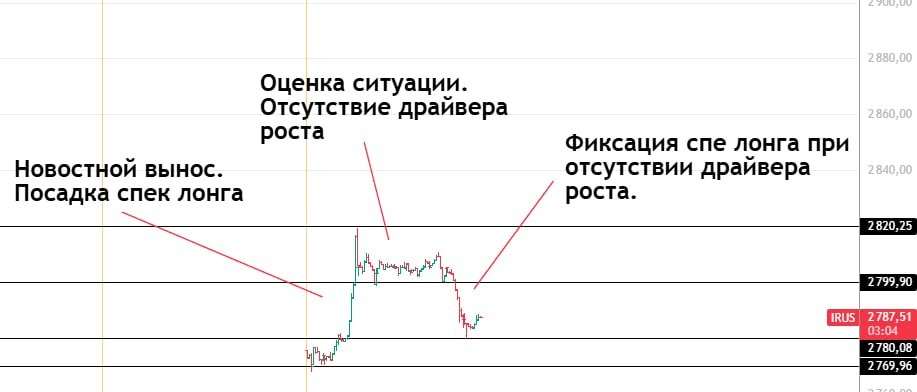 : Мы сегодня делали ставку на работу от шорта. Локальные максимумы, отсутствие видимого драйвера роста, перевес спекулятивного лонга. _________ С открытия пошли в запланированную коррекцию. Затем выноос на новостях. Оценив новость мы не стали переобуваться а продолжили работу на тех откат тк как я не посчитал что новости имеют долгоиграющий позитив. В приоритет поставил инструменты с макс выносом вверх тк как в них набилось больше всего спек лонга. _______ Расчет ПОСЛЕ новостного выноса был такой же как и до начала сессии, на фиксацию спекулятивного лонга в отсутствии драйвера роста. _____________ В общем все по плану, не без форс мажора конечно, но логика на 100% себя отработала. ______ Это и есть логика интрадея.