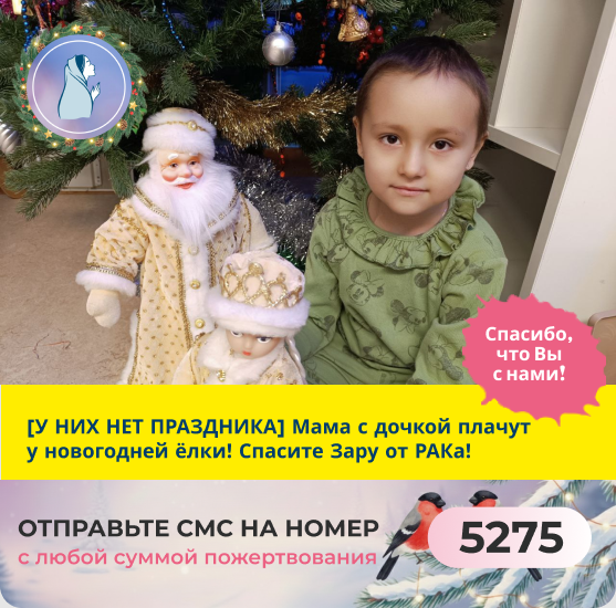 Этот Новый год Зара встречает с РАКом. Страшно даже представить, что это за праздник для неё. Но она может уже не встретить следующий, если мы пройдём мимо. Спасите Зару! Чудесного Нового года, друзья! «Здравствуйте, наша дорогая команда помощников! С наступающим Новым годом вас! Меня зовут Василина, а это моя крошечка-дочка Зарочка! Мы всегда верили и продолжаем верить в чудеса. Мы загадали главное желание! Чтобы Зарочка поскорее выздоровела. Чтобы мы смогли купить ей лекарство, которое поможет навсегда прогнать РАК! Помогите нам его получить, поддержав наш сбор в фонде «Ксения спасает жизни». Желаем и вам самого главного в жизни — здоровья!». Зара и её мама. У этой девочки только одна надежда: это Ваша помощь! Отзовитесь, Вы так нужны Заре! "Самый трудный Новый год мы с Зарой встречали в больнице, уже зная диагноз. Мы проживали свою беду в палате вдвоём. Вопреки всему, я создавала доченьке атмосферу Нового года, установила ёлочку, повесила гирлянды, и, конечно, мы ждали Деда Мороза и