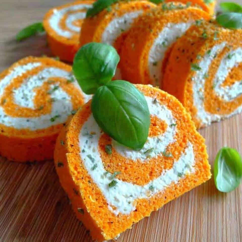 Для : 8 человек Приготовление : 25 минут Отдых: 1 час в прохладном состоянии 📝 Ингредиенты Для бисквитного рулета с морковью 🥕 250 г вареной моркови 🥚 4 яйца (отдельно белки и желтки) 🧂 1 щепотка соли ⚪ 50 г муки 🧀 40 г тертого сыра (Эмменталь или пармезан) 🧈 1 столовой ложки масла Для начинки 🧀 250 г свежего сыра типа Филадельфия 🌿 2 столовые ложки измельченного свежего базилика 🌱 1 столовой ложки зеленого лука 🧂 1 щепотка соли ⚫ Черный перец 👩 🍳 Пошаговое приготовление 1.🥕 Подготовьте морковь Приготовленную морковь перемешайте до получения однородного пюре. Дайте полностью остыть. 2. Сделайте основу для теста В салатнице взбейте яичные желтки с маслом. Добавьте морковное пюре, муку, соль и тертый сыр. Перемешайте, пока не получите однородную массу. 3.🕊 Подготовьте белковую массу В другой миске взбейте белки до пиков. Аккуратно добавьте их в предыдущее блюдо, чтобы тесто оставалось воздушным. 4.🔥 Испечь тесто Выложите тесто на противень, застеленный бумагой для выпечки,
