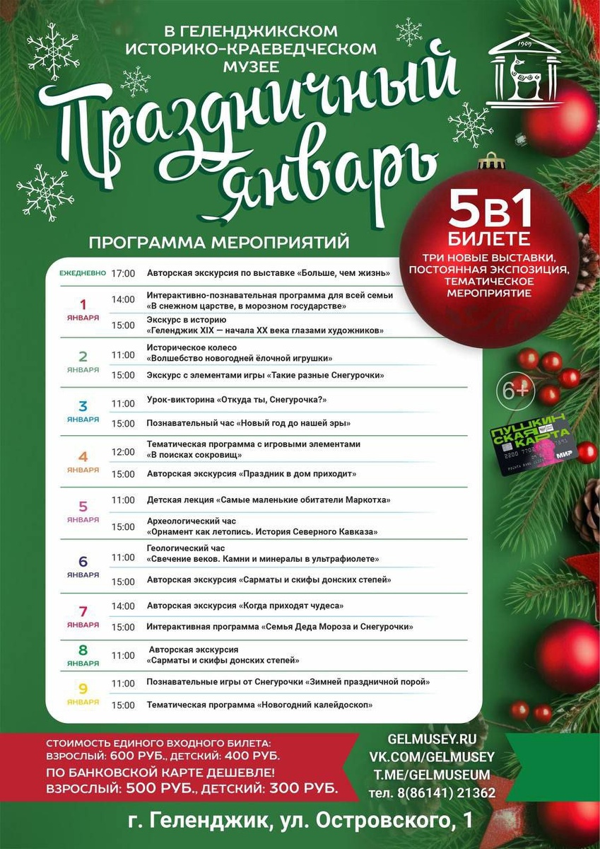 ✨ Когда отгремят новогодние ёлки и утренники, а праздничные застолья декабря останутся позади, и в длинные январские выходные вы захотите увлекательно провести время всей семьёй — вас будет ждать насыщенная интерактивная программа в Геленджикском историко-краеведческом музее. 🔥 Программа мероприятий 📅 1 января В 14:00 — интерактивно-познавательная программа для всей семьи «В снежном царстве, в морозном государстве». В 15:00 — экскурс в историю «Геленджик XIX — начала XX века глазами художников». В 17:00 — авторская экскурсия по выставке Зураба Церетели "Больше, чем жизнь". 📅 2 января В 11:00 — историческое колесо «Волшебство новогодней ёлочной игрушки». В 15:00 — экскурс с элементами игры «Такие разные Снегурочки». В 17:00 — авторская экскурсия по выставке Зураба Церетели "Больше, чем жизнь". 📅 3 января В 11:00 — урок-викторина «Откуда ты, Снегурочка?» В 15:00 — познавательный час «Новый год до нашей эры». В 17:00 — авторская экскурсия по выставке Зураба Церетели "Больше, чем