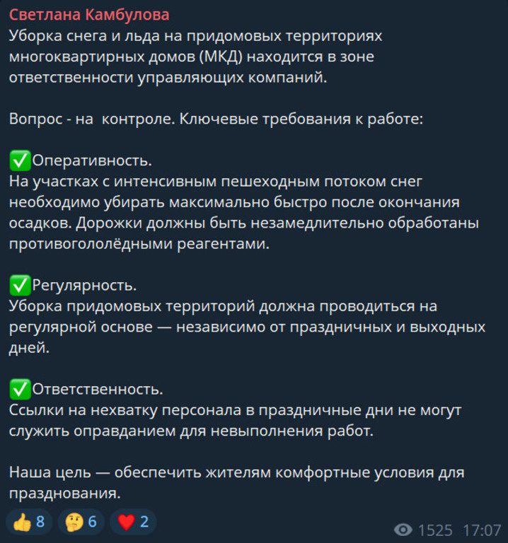 Слова правильные. Вот только чтобы требовать, неплохо бы самой показывать пример. Давайте проверим эти три пункта на практике городской администрации: ❌ Оперативность. Третий день город засыпан снегом. Социальные сети пестрят фото и видео — дороги в отвратительном состоянии после небольшого снегопада. Техника либо не выезжает, либо проезжает без щёток. ❌ Регулярность. Это вообще не про расчистку Таганрога. Иначе уже был бы виден результат. А его нет. ❌ Ответственность. Как же Камбулова любит играть с этим словом! Жители Таганрога с удовольствием ждут того момента, когда глава города понесёт ответственность за свою работу. Пока что видим только требования к другим. Кстати, полтора месяца назад Камбулова позировала перед коммунальной техникой и уверяла: город готов к снегу. Где эта оперативность, регулярность и ответственность сейчас? У вас в УК с тремя пунктами лучше, чем у городской администрации?