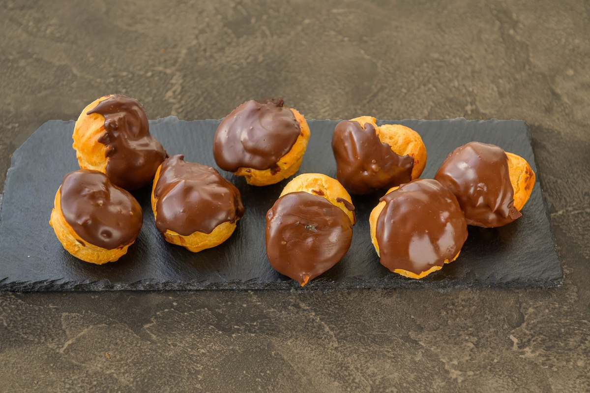 Вода 250 мл, сливочное масло 110 г, мука 150 г, яйца 5 шт., молоко 500 мл, сахар 160 г, желтки 4 шт., кукурузный крахмал 40 г, шоколад 180 г. Заварное тесто готовят на плите, затем вводят яйца по одному. Профитроли выпекают до уверенного золотистого цвета. Заварной крем варят до густоты и полностью охлаждают. Наполняют пирожные кремом и покрывают тёплой шоколадной глазурью.