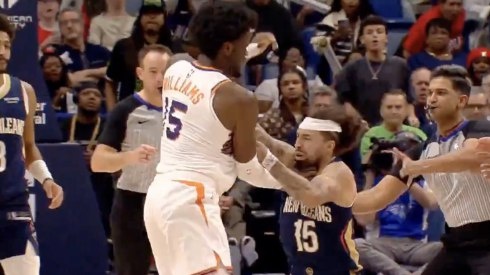 Матч Национальной баскетбольной лиги между "Пеликанс" и "Санз" обернулся дракой между защитником Хосе Альварадо и центровым Марком Уильямсом. Разница в росте между ними составляет более 30 сантиметров, передаёт Tengri Sport.