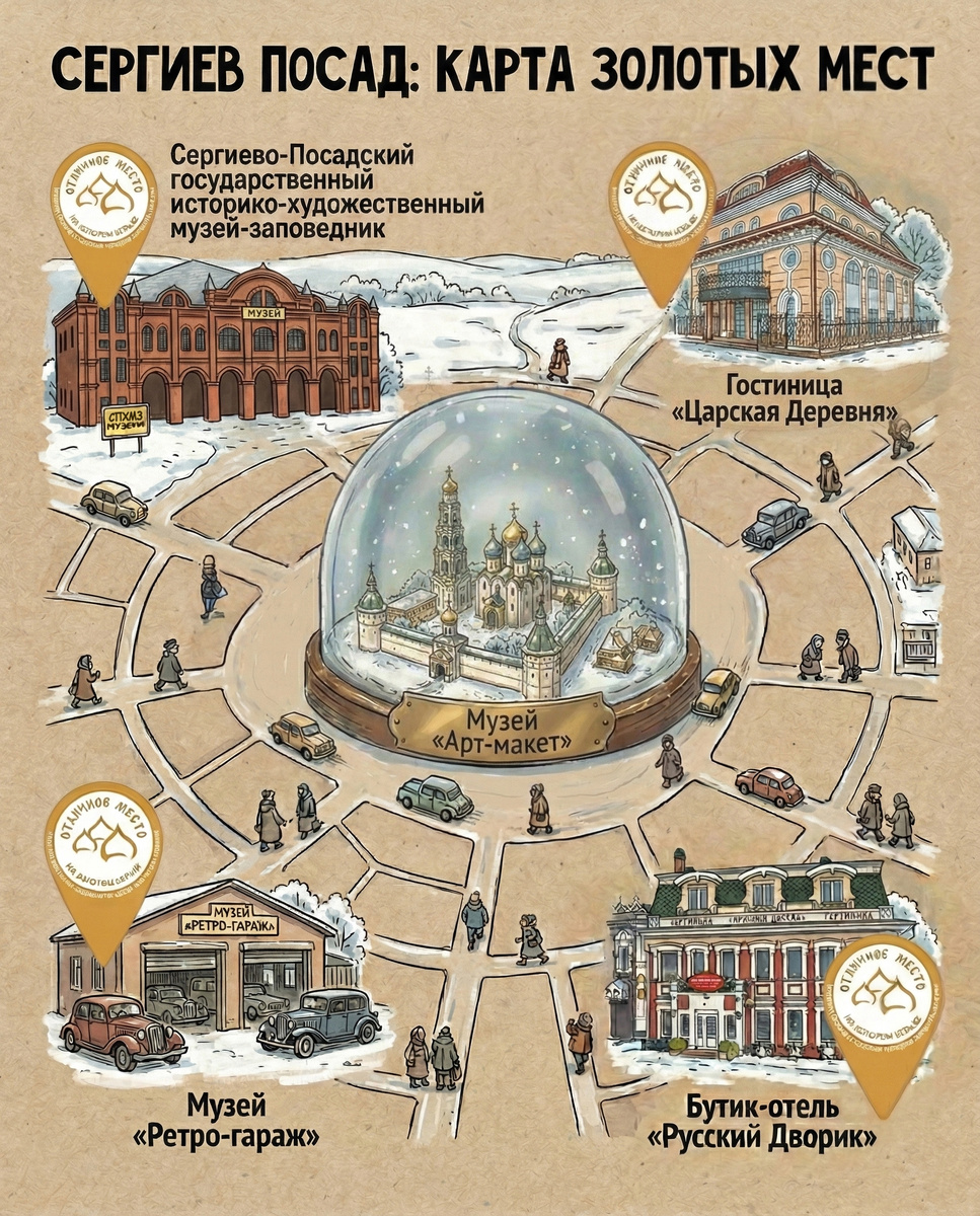 Обычно от словосочетания «межрегиональный конкурс» сводит скулы — веет скукой и отчетами. Но тут случай особый. Союз городов Золотого кольца решил пометить места, где туристу реально рады, а не просто терпят его присутствие. Сергиев Посад — в топе. Доказали, что мы не только духовный центр, но и место, где комфортно. Музеи: Отели: ▫Гостиница «Царская Деревня». Весь 2026 год эти ребята будут козырять знаком «Отличное место». Для туриста это маяк: здесь не нахамят, накормят и спать уложат. Это не удача. Это результат пахоты над туристической привлекательностью. Полный список победителей (вдруг решите изменить Посаду с Ярославлем): goldenringunion.ru