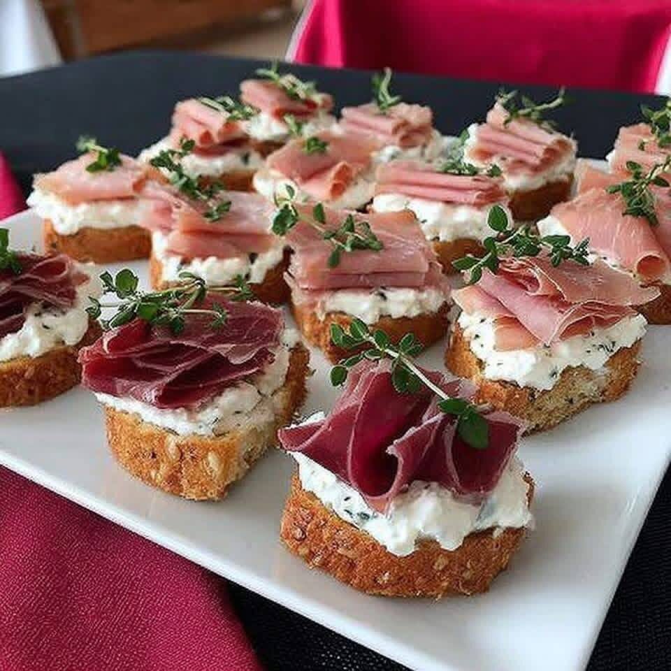 👥 Для : 8 человек (24 кростини) ⏱️ Приготовление : 15 минут 🧺 Ингредиенты 🍞 1 багет, нарезанный на 24 ломтика 🧈 30 г сливочного масла 🧀 250 г рикотты 🌿 1 столовой ложки нарезанной свежей зелени (тимьян, зеленый лук или петрушка) 🧂 1 щепотка соли ⚪ 1 щепотка перца 🍖 120 г сырой ветчины (тонкими ломтиками) 🍖 120 г белой или вареной ветчины (тонкими ломтиками) 🌿 Несколько веточек свежего тимьяна для отделки 👨 🍳 Подробное приготовление 1. Поджарьте ломтики багета Выложите ломтики хлеба на противень. Слегка смажьте их растопленным сливочным маслом, затем запекайте при температуре 200°C в течение 8 минут, пока они не станут золотисто-коричневыми и хрустящими. 2.🧀 Приготовить крем из рикотты В миске смешайте рикотту с нарезанной зеленью, солью и перцем. Слегка взбейте, чтобы получилась воздушная, растекающаяся текстура. 3️⃣ 🍞 Намазать кростини Нанесите обильный слой крема из рикотты на каждый поджаренный ломтик хлеба. 4.🍖 Добавьте ломтики ветчины Выложите на кростини либо небо
