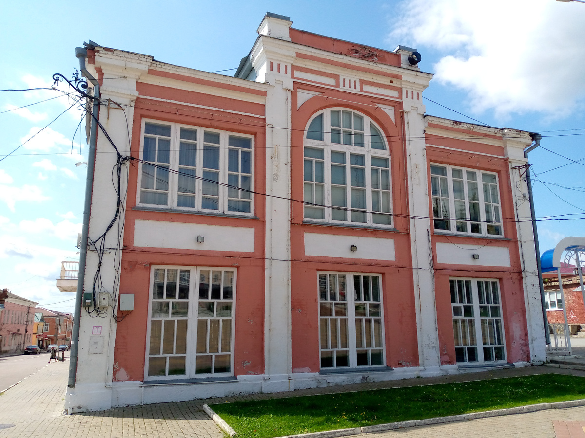 Двухэтажное кирпичное прямоугольное в плане здание северным фасадом выступает на пл. Ленина, восточным протяженным на красную линию ул. Мира. Северный и восточный фасады – главные. Южный фасад с проемом входа по центру в основном повторяет композицию северного, западный фасад — восточного, но на высоту первого этажа имеет пристройку. Композиция фасадов симметричная. Средние части фасадов (по восточному и западному в три оси, по северному и южному в одну ось) повышены по отношению к основному объему. Восточный фасад лопатками делится на пять частей. Его северная и южная части понижены по отношению к трем центральным и прорезаны двумя проемами высоких прямоугольных двустворчатых окон на втором этаже и такими же по ширине, только без створок, окнами на первом этаже (за исключением окна южной части фасада, где оконный проем занимает всю плоскость и его крайняя створка расшита под дверной проем). Три центральные части фасада представляют собой слегка заглубленные огромные, на высоту двух э