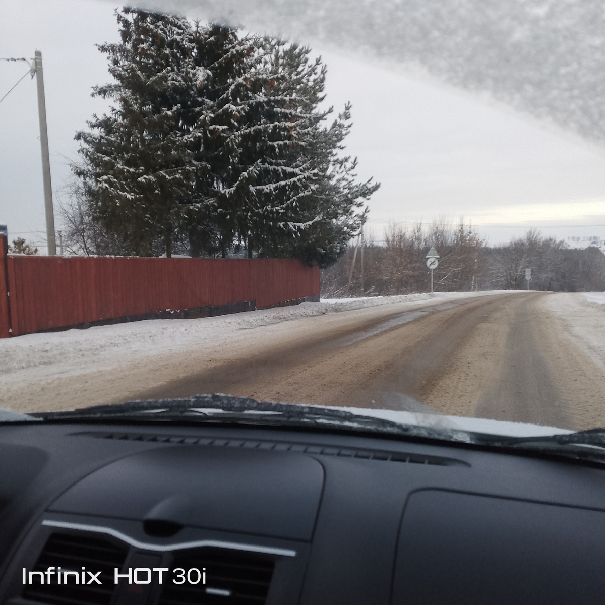 Погодка зимняя, дорогу посыпают реагентами, поэтому на ней снега нет. С утра было -13, потом -5.