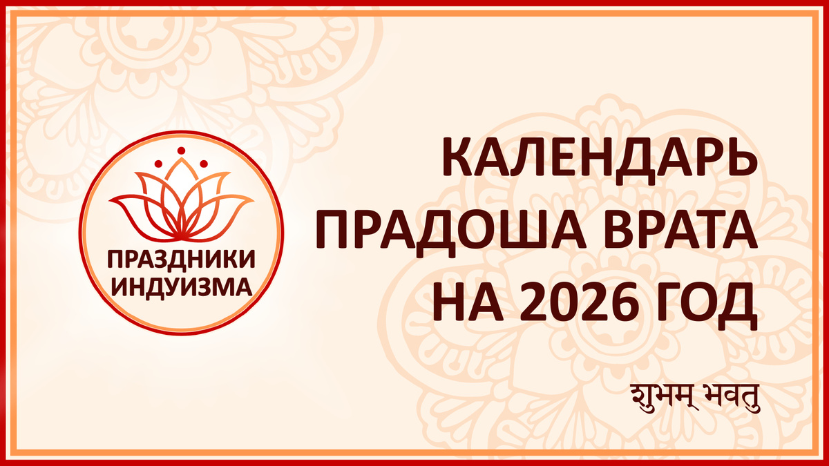 Полезные статьи: «Что такое Врата?», «О Прадоша Врата», «Как соблюдать Прадоша Врата?» Прадоша Врата соблюдается в Трайодаши Шукла и Кришна Пакша. Днем Прадоша Врата принимается день, когда Трайодаши титхи приходятся на Прадоша Кала[1], которое начинается после захода солнца. Следовательно, Прадоша Врата может соблюдаться в Двадаши. Гимны Шиве Календарь подготовлен для Москвы и Санкт-Петербурга. 01 января 2026 — Гуру Прадоша Врата 16 января 2026 — Шукра Прадоша Врата 30 января 2026 — Шукра Прадоша Врата 14 февраля 2026 — Шани Прадоша Врата 28 февраля 2026 — Шани Прадоша Врата 16 марта 2026 — Сома Прадоша Врата 30 марта 2026 — Сома Прадоша Врата 14 апреля 2026 — Бхаума Прадоша Врата для СПб 15 апреля 2026 — Будха Прадоша Врата для МСК 28 апреля 2026 — Бхаума Прадоша Врата 14 мая 2026 — Гуру Прадоша Врата 28 мая 2026 — Гуру Прадоша Врата 12 июня 2026 — Шукра Прадоша Врата 26 июня 2026 — Шукра Прадоша Врата 12 июля 2026 — Рави Прадоша Врата 26 июля 2026 — Рави Прадоша Врата 10 августа 202