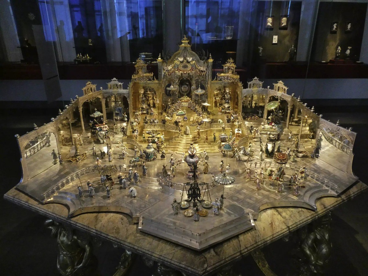 «Восточная сказка» и другие шедевры ювелира-виртуоза Динглингера, которые невозможно повторить Иоганн Мельхиор Динглингер (1664–1731) — выдающийся немецкий ювелир XVIII столетия. Его творчество совпало с расцветом барокко — эпохи пышности и богатства. Монархи и аристократы состязались в роскоши, окружая себя изысканными предметами. Многие ювелиры того времени, среди которых был и Динглингер, создавали украшения для дворцов, изготавливали сервизы, вазы, табакерки и статуэтки. Отличительная черта работ Динглингера — изящный стиль, виртуозное сочетание материалов и безупречная детализация. Одним из шедевров мастера стала композиция «Двор Великого Могола Аурангзеба в Дели в день его рождения», созданная в 1707–1708 годах (фото 1, 2). Она украшена 4909 алмазами, 160 рубинами, 164 изумрудами, одним сапфиром, 16 жемчужинами и двумя камеями. Всё это великолепие дополнено золотом, серебром, эмалью, лаковой живописью и древесиной. Эти и другие произведения, хранящиеся в дрезденской галерее «G