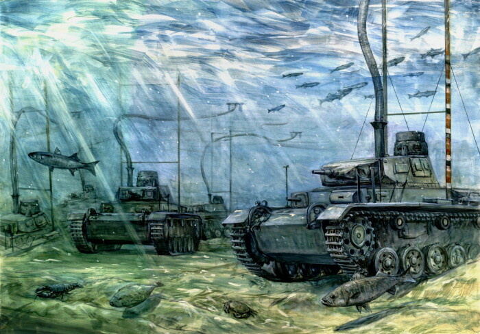Для морского десанта на побережье Англии немецкие конструкторы переделали небольшое число всех состоявших у них на вооружение танков. При этом лёгкие машины — Pz.II, «научили» плавать, за счёт прикрепляемых понтонов, а более тяжёлые — Pz.III и Pz.IV, оборудовали для передвижения по дну. Первые получили названия Schwimmpanzer II, вторые Tauchpanzer III и Tauchpanzer IV. О том, как это сделали написано много, не буду тратить на это время.