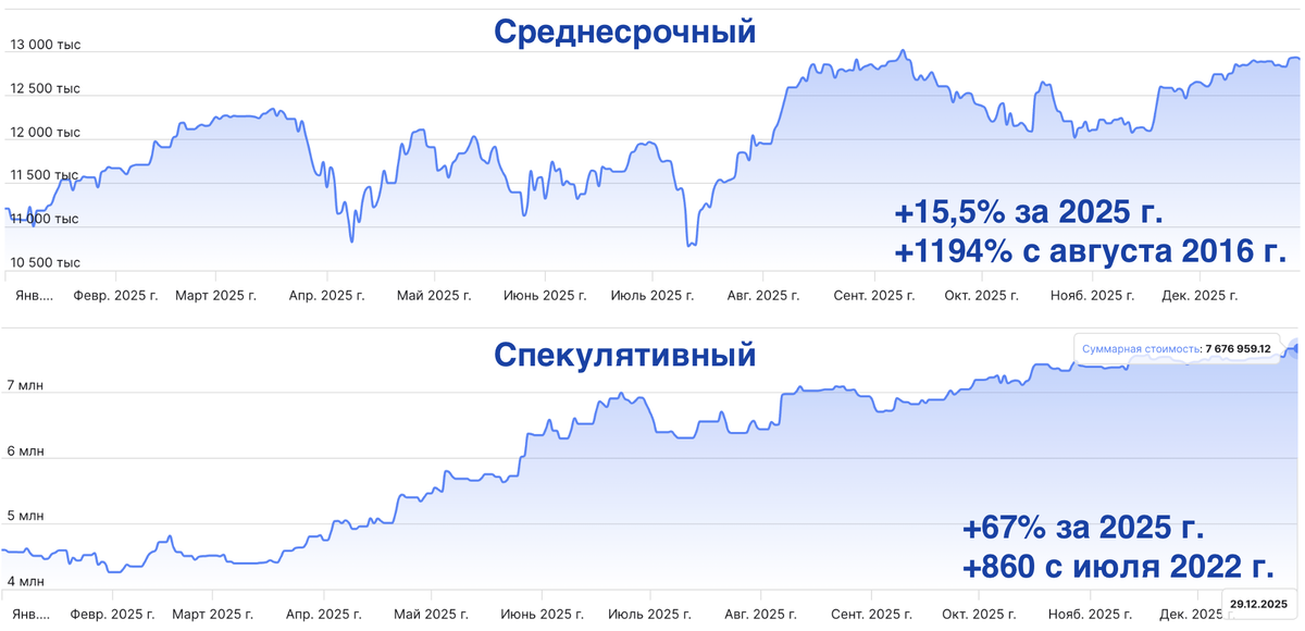 Всех приветствую! Традиционно подвожу итоги года и публикую результаты портфелей. Завтра вряд ли кто-то будет торговать или читать , поэтому делаю это сегодня. В спекулятивном портфеле на данный момент открытых сделок нет. Этот год стал самым сложным за всю мою карьеру. Настолько неликвидного и перегруженного новостями рынка я ещё не видел. При этом, оглядываясь назад, возможностей было достаточно. Индекс МосБиржи за 2025 г. снизился на −5,20%, а от годовых максимумов — на -18,8%. Тем не менее удалось существенно обогнать рынок. Спекулятивный портфель - Доходность с 11 июля 2022 г.: +859,62% - Доходность за 2025 г.: +67% - Суммарная доходность сделок: 450,13% - Максимальная доходность сделки: +15,78% - Самая убыточная закрытая сделка: -4,70% - Средняя доходность сделки: +0,92% - Количество сделок: 338 - Прибыльных: 216 (64%) - Убыточных: 122 (36%) Среднесрочный портфель - Доходность с 17 августа 2016 г.: +1194% - Доходность за 2024 г.: +15,45% - Суммарная доходность сделок: +241,86% -