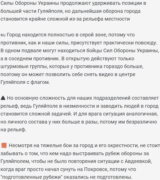 Понимаем, что делать разбор постов от "DeepLate" это уже моветон, но пройти мимо этого потока сознания админ не смог. Все уже знают, что ребятишки из некогда "картографов" превратились в типичный рупор украинской пропаганды, который, невзирая на объективную действительность, доносит до населения нужные тезисы. Итак, вводная часть кончилась, и сейчас я распишу поминутно, где мальчуганы были неправы. Очередной тезис о серой зоне уже набил оскомину, потому что они пишут это буквально про каждый населенный пункт, освобожденный нашими войсками. По их мнению, в городе до сих пор находятся группы ВСУ (вопрос только — в каком виде), однако это все еще не объясняет, каким тогда образом военнослужащие ГВ "Восток" смогли запечатлеть 41 флаг в данном населенном пункте. Если там еще остался Дед Тарас, то пусть тоже выйдет в центр города и покажет флаг. Конкретно в этой статье у них хватило ума даже найти карту высот, чтобы найти новое оправдание своих неудач. Предыдущие косяки они пытались оправ