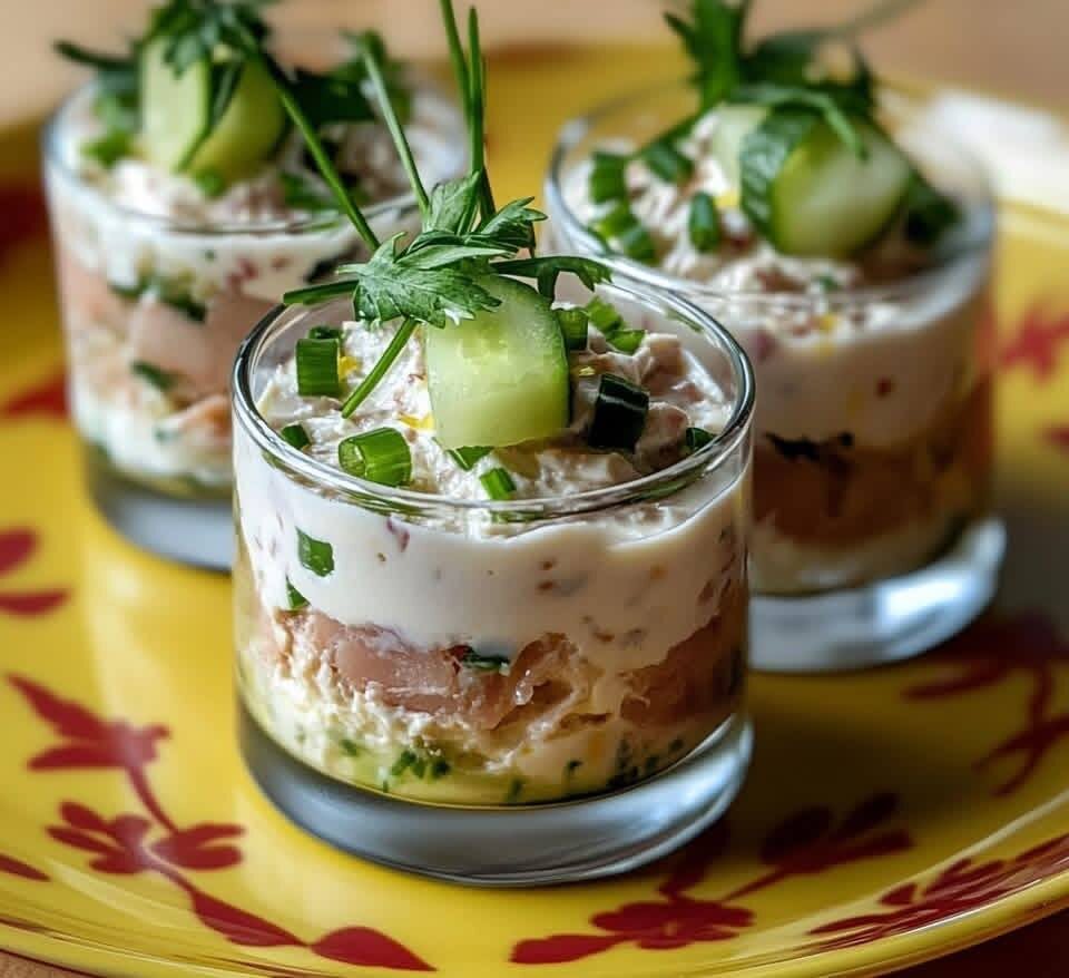 Для : 4 человек Время приготовления : 12 минут Ингредиенты (с весом) 200 г копченого лосося, нарезанного небольшими кусочками 200 г свежего сыра (типа сливочного сыра) 80 г огурца, нарезанного мелкими кубиками 20 г нарезанного свежего зеленого лука 10 г измельченной зелени петрушки 10 г лимонного сока 2 г черного перца 1 г соли Этапы приготовления🧑 🍳 1. Приготовить крем из свежего сыра 🥣 Смешайте свежий сыр с лимонным соком, солью, перцем, луком и петрушкой. Получить однородную, слегка воздушную текстуру. 2. Приготовить огурец 🥒 Нарежьте огурец небольшими ровными кубиками. Отложите несколько штук для окончательного украшения. 3. Укладываем слои ✨ Положите первый слой копченого лосося на дно каждой чашки. Затем добавьте слой сырного мусса Дополните несколькими кубиками огурца. Выложите еще слой мусса 4. Украшение 🌿 Сверху добавьте небольшой кубик огурца. Аккуратно посадите несколько веточек зеленого лука. Посыпать зеленью петрушки для придания объема. 5. Охладить ⏱️ Поставьте бокал