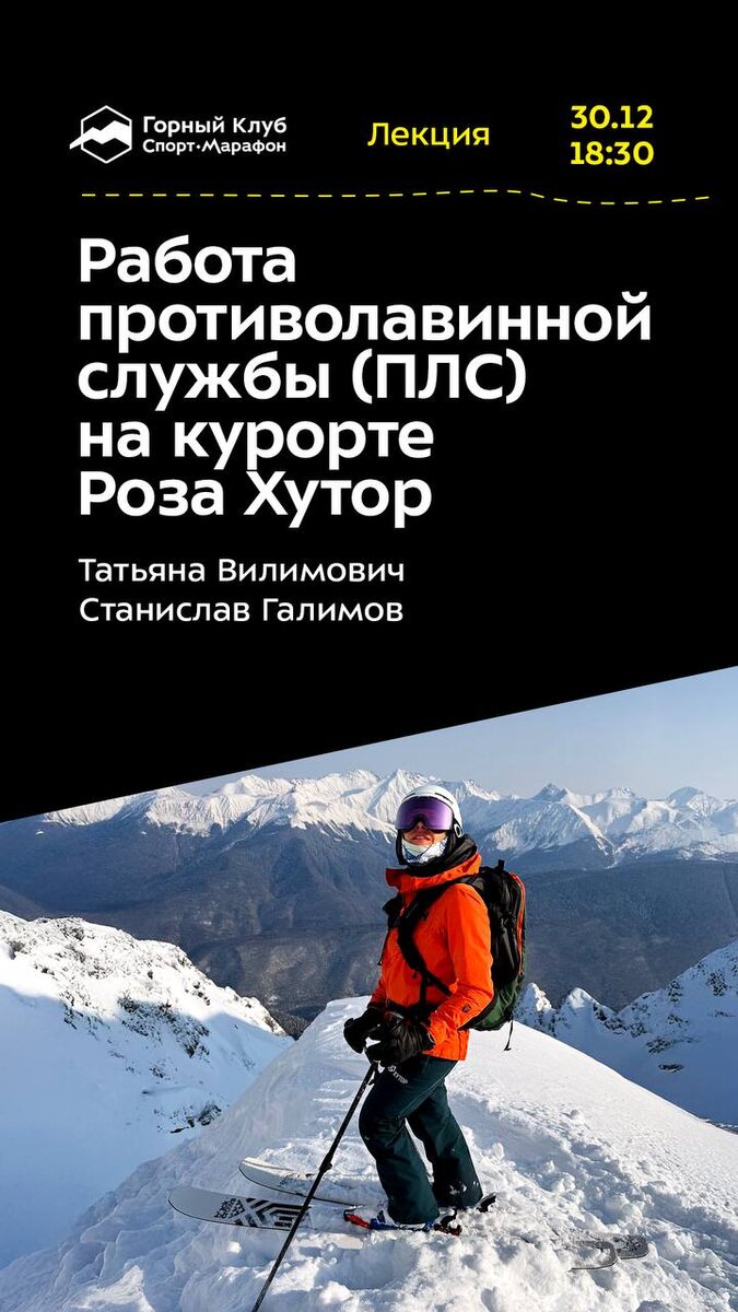 ⬇️ 📆 30 декабря 18:30 | среда Работа противолавинной службы (ПЛС) на курорте Роза Хутор Лекция от инженеров по проведению лавинных работ Роза Хутор, профессионалов с многолетним практическим опытом — Татьяны Вилимович и Станислава Галимова. На лекции вас ждет знакомство со службой, последовательный рассказ о подготовке Курорта к зимнему сезону, в том числе о том, как готовят систему Gazex, работа которой неизменно сопровождает отдых на горнолыжном курорте каждый зимний сезон. 📆 2 января 18:30 | пятница PUMA TRAINING: Комплексная тренировка. Горнолыжный сезон 2025/26, приходите тренироваться вместе с PUMA TRAINING и Горным Клубом Спорт-Марафон! 1,5 часа. Только практика. Надежда Шамбер — тренер, тренер-реабилитолог в команде Rehab Russia, массажист, действующая спортсменка FWTQ, чемпионка России по фрирайду. 📆 3 января 18:00 | суббота Квиз, плиз! [КАРАОКЕ] ПОД ЁЛКОЙ Let it snow! Чтобы Новый год был снежным, нужно громко петь любимые песни. Даже если вам кажется, что вы знаете м
