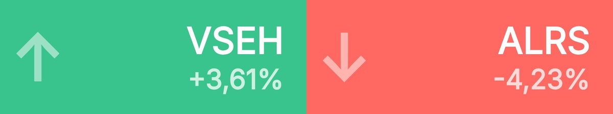 : ВИ.ру • 72,00 ₽ • 3,61% Медикал Гр • 1 458 ₽ • 1,79% ЕвроТранс • 145 ₽ • 1,23% Т-Технолог • 3 275 ₽ • 0,85% НЛМК • 107 ₽ • 0,81% Роснефть • 410 ₽ • 0,32% Группа Рус • 112 ₽ • 0,30% Озон • 4 490 ₽ • 0,22% Циан • 603 ₽ • 0,13% Лукойл • 5 795 ₽ • 0,09% 🔻 Топ-10 лидеров падения среди крупнейших акций: Алроса • 41,18 ₽ • -4,23% Московский • 6,15 ₽ • -2,98% VK • 297 ₽ • -2,88% Группа Поз • 993 ₽ • -2,69% Норильский • 148 ₽ • -2,50% ФосАгро • 6 321 ₽ • -2,38% ЮМГ • 797 ₽ • -2,37% Европлан • 552 ₽ • -2,35% РуссНефть • 97,30 ₽ • -2,21% Селигдар • 43,44 ₽ • -2,16%