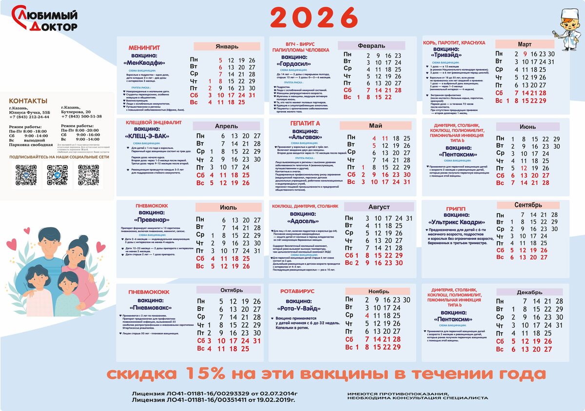 ! ДОРОГИЕ НАШИ! Мы рады представить вам уникальный прививочный календарь, разработанный специально для вашего удобства и здоровья всей семьи. Теперь каждый месяц вас ждет приятная новость — специальная скидка на определенную вакцину! ✨ Почему это важно? Регулярная вакцинация помогает защитить себя и близких от опасных заболеваний. Наш календарь станет вашим надежным помощником в поддержании иммунитета и обеспечит дополнительную экономию при каждом визите. 🌟до Нового года осталось 2 дня🫠