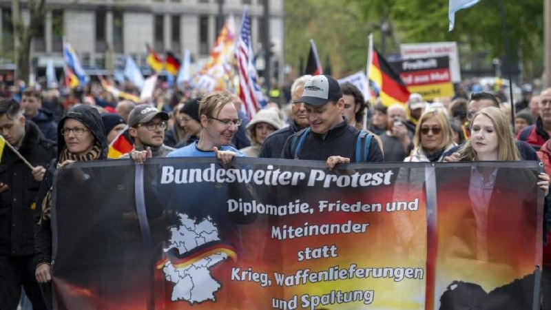 сплоченности Европы (54 % опрошенных) . Это на три процентных пункта меньше, чем в аналогичном февральском опросе. На второе место 37 % респондентов (ранее 38 %) поставили повышение обороноспособности Германии. На третьем месте у 28 % (ранее 20 %) оказалась новая задача — ограничить влияние авторитарных государств. Глобальная борьба с изменением климата опустилась на четвертое место (23 %, ранее 26 %). Укрепление отношений со странами Глобального Юга, такими как Индия, Бразилия или страны Африки, почти неизменно называют 20 % (ранее 19 %). А вот расширение поддержки Украины имеет для граждан Германии наименьший приоритет — всего 7 %, в то время как в феврале этот пункт называли 17 % опрашиваемых. Динамика скорее положительная, но говорить о потенциальной нормализации отношений, судя по этим данным, можно будет очень нескоро. (Надпись на плакате: Федеральный протест. Дипломатия, мир и взаимодействие вместо войны, поставок оружия и раскола, апрель 2025, Берлин).