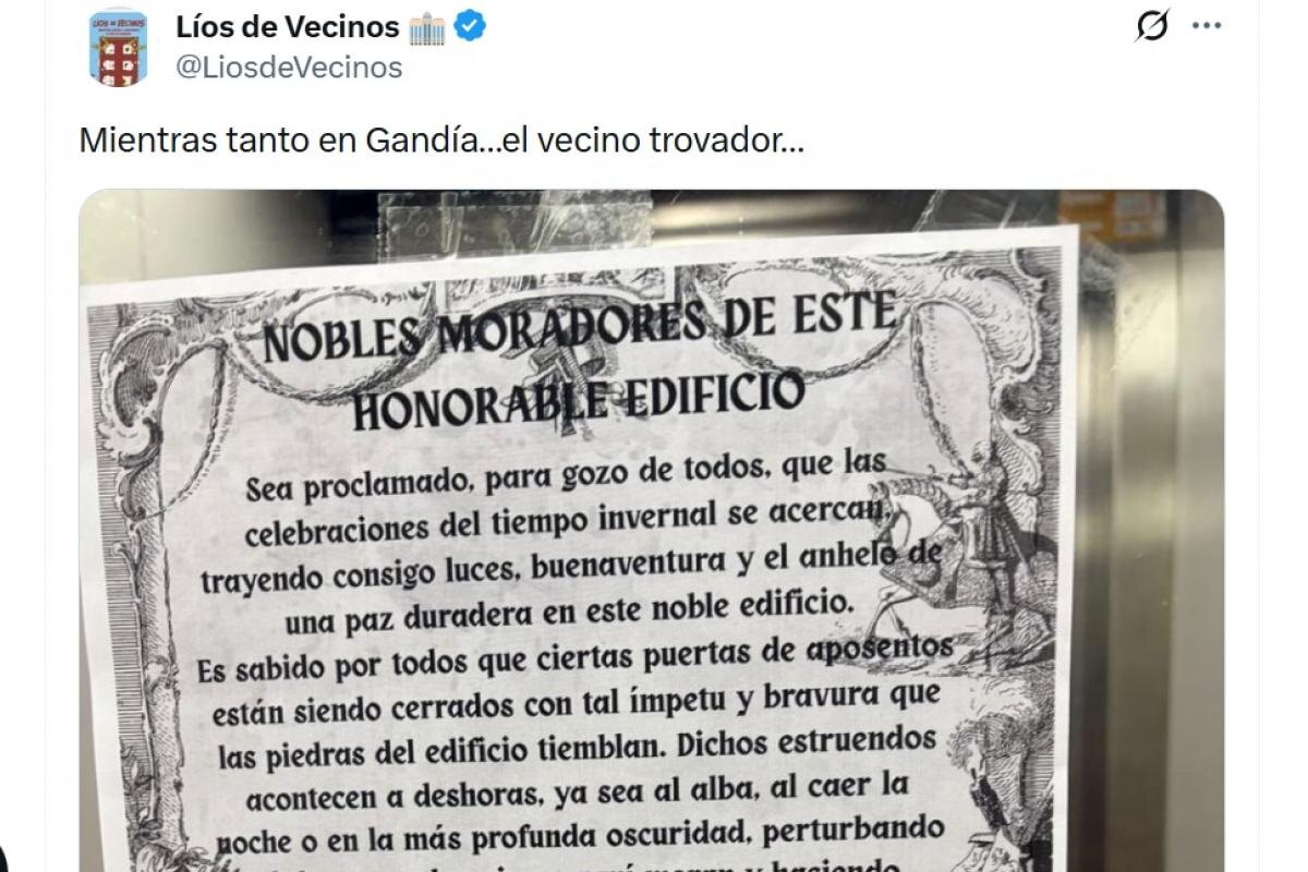 В одном из многоквартирных домов Гандии (Gandía), что в Валенсии, жильцы неожиданно обнаружили в лифте весьма оригинальное объявление. Вместо привычных сухих предупреждений или раздражённых записок, на стене появился плакат, написанный языком, будто бы сошедшим со страниц рыцарских романов. Автор обращения решил напомнить соседям о важности тишины, но сделал это с изрядной долей креатива и юмора. В начале послания всех обитателей дома величают «благородными жителями» и приглашают задуматься о том, как сильно хлопки дверей нарушают покой. По словам автора, некоторые жильцы закрывают двери с такой силой, что кажется, будто стены дрожат, а сам дом превращается в осаждённый замок. Такой подход сразу привлёк внимание и вызвал улыбку у многих, кто прочитал необычное послание. Далее в объявлении отмечается, что шум раздаётся в любое время суток — и ранним утром, и поздно ночью, и даже в самые тихие часы. Это, по мнению автора, мешает отдыху и создаёт ощущение постоянной тревоги. В тексте даже