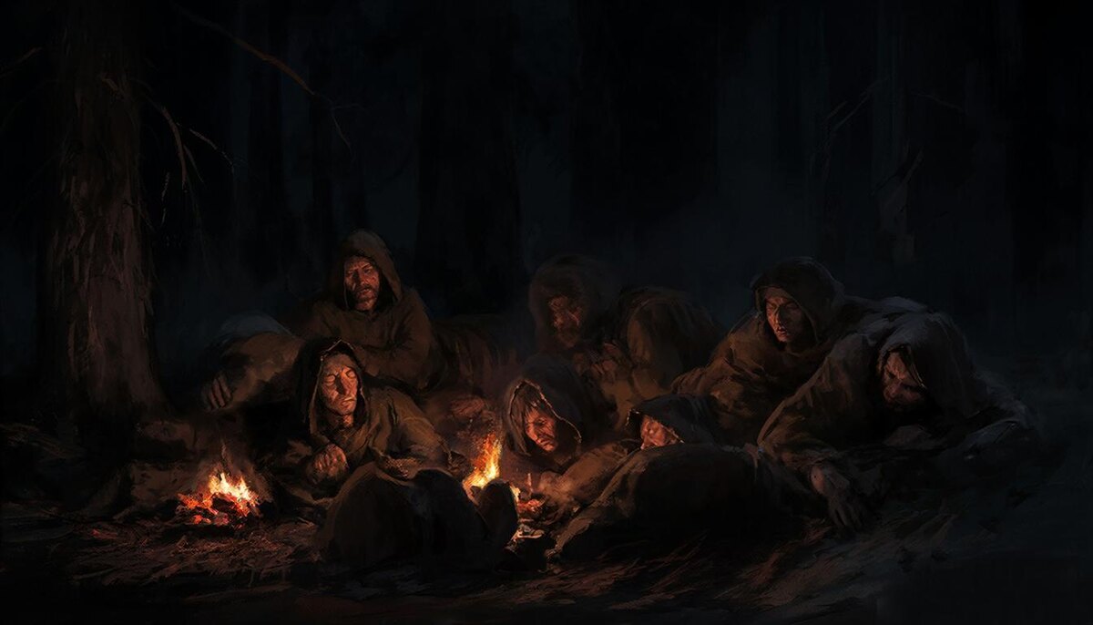 Дующий в спину ветер не давал уснуть. Я попробовал перелечь на другую сторону от костра. Здесь было ещё больше дыма, пепла и искр, но несколько теплее. Мне удалось втиснуться между спящими людьми и самым огнём. Одной стороне тела стало тепло, на столько, что штаны на мне раскалились. Несколько искр прожгли штанину насквозь.